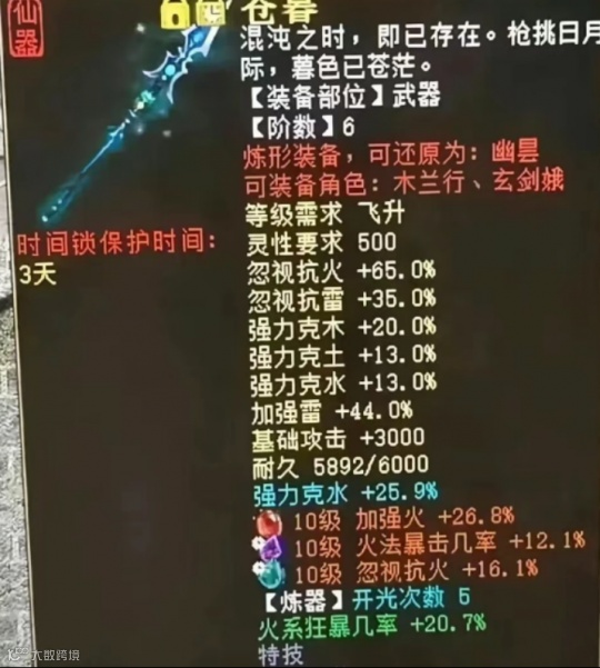 底子忽视抗火65,蓝字强力克水25,炼器火系狂暴几率20.7,三块10级石头最为显眼,忽视抗火16.1、加强火26.8,总忽视抗火高达81.1,还有比这忽视更多的仙法武器吗,求超越!