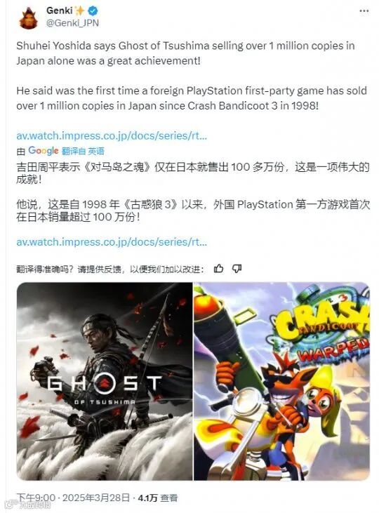 近期,前索尼总裁吉田修平在接受采访时,提到了《对马岛之魂》在日本本土的销售情况。这款发布于2020年的游戏,现已在当地卖出了超100万份。同时这也是自《古惑狼3:N.O,近20年来第二款销量超百万的海外团队开发游戏。