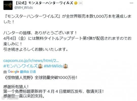《怪物猎人:荒野》发布于2月28日,至今刚满一个月。首月销量突破1000万份,也是卡普空历史上销量数据最好的作品。