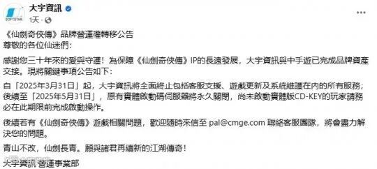 今日,大宇资讯发布《仙剑奇侠传》品牌营运权转移公告:自2025年3月31日起,将全面终止对《仙剑奇侠传》系列游戏的客服支持、游戏更新及系统维护等所有服务。此外,游戏实体版激活码服务器将在2025年5月31日永久关闭。