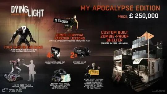 这个《消逝的光芒》典藏版包含许多赠品,其中就包括:将购买者的脸扫描后放入游戏永久保存、等身大小的怪物雕塑、“僵尸生存”跑酷课程、夜视仪,前往Techland参观的全额往返旅行和签名版本的4份游戏。