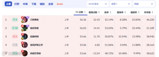 同时,在破舰者的帮助下,上单位置的英雄T度也迎来了洗牌。一个已经沉寂许久的英雄刀妹,在现版本的强度已经冲上了独一档的T0级别。这在一群坦克兄贵中间,显得格外鹤立鸡群。