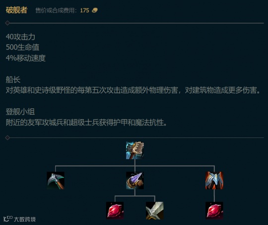 破舰者的面板属性能够提供40点攻击力、500点生命值以及4%的移速,这对除AP英雄之外的所有英雄都适用。同时,装备特效中“对英雄、史诗野怪和建筑能造成额外物理伤害”的描述,则吸引了ADC英雄的注意。