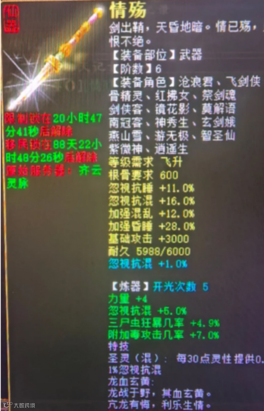 十六级武器,底子忽视防御几率79.2、忽视防御程度82.8,蓝字根骨4,炼化出忽视混9、敏捷8的属性,炼化很正,就是底子歪了,可惜可惜呀!