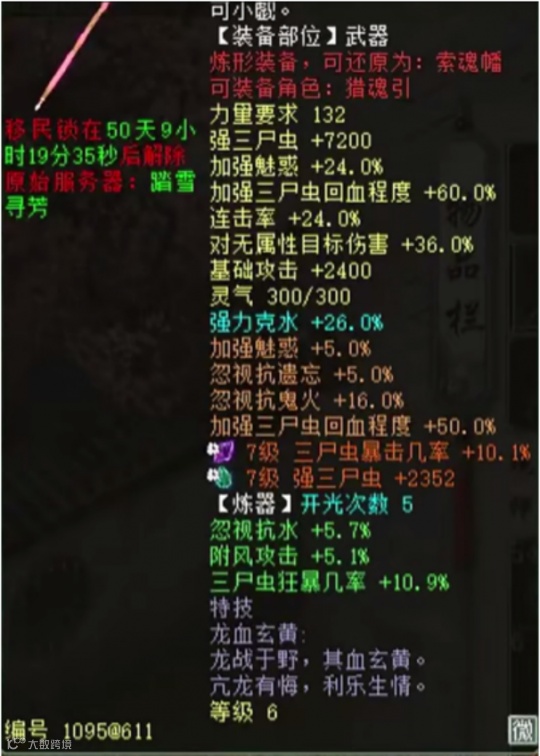 六级双回神兵,底子加强三尸虫7200、加强三尸回血程度60,蓝字加强克水26,炼器三尸虫狂暴几率10.9,大家觉得如何,还有比这属性更好的嘛?