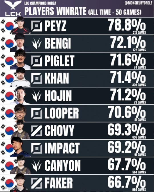 LCK常规赛即将开启,而在进入新的赛年之前,外网统计网站Monsieur Yordle,还带来了LCK选手的历史胜率排名。实际情况则出乎许多人的预料,一些选手的排名跟大家印象中有着不小的差距。