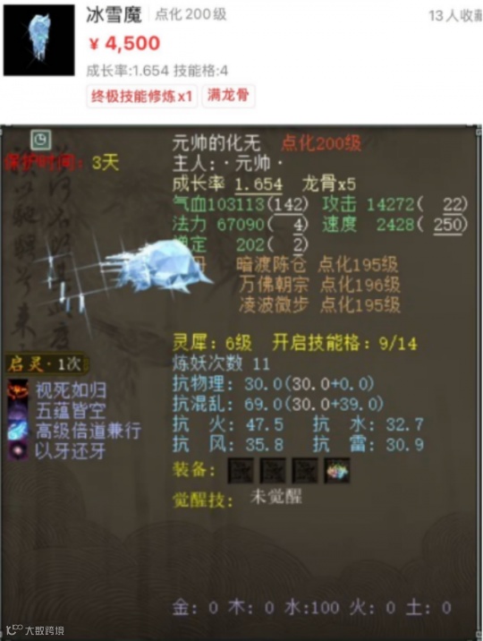 最近很多玩家热衷于修终极,藏宝阁的问号召唤兽都开始涨价了,今天这位大哥耀修两只问号冰雪魔和一只问号天龙女,希望能顺利爆出化无!