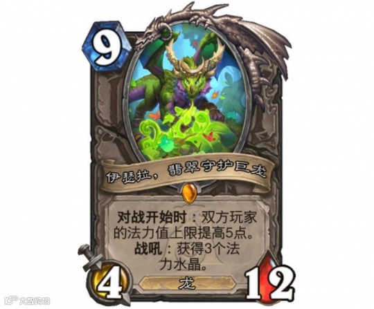 这张新古夫卡就是新版本提前赠送的橙卡伊瑟拉·翡翠守护巨龙,其效果是能在对战开始时将双方玩家的法力值上限提高5点,如果双方玩家都带的话,每个人的法力值上限就能变成20点。