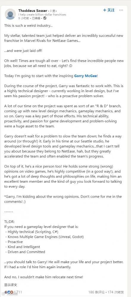 在这则动态中,Thaddeus Sasser称赞了他的团队在开发《漫威争锋》时的出色表现。对于团队被解雇的情况,他感到难以理解。Thaddeus Sasser曾向网易问询原因,但并未得到回应。不过,处于中国的开发团队未受影响。