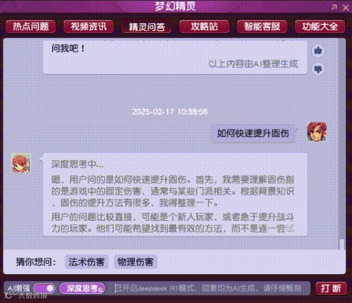 在昨天游戏更新维护后,除了口袋版的兵器库玩法关闭外,还有一项重要的改动,那就是梦幻精灵正式接入了DeepSeek。现在的梦幻精灵在保有以往的全部功能外,一些攻略类和推理类的问题也能够通过AI解决。不仅是游戏里的问题,AI对于游戏外的对话思考功能也依然还在。
