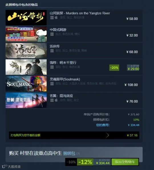 这份捆绑包包含六款国产独立游戏,它们分别是《苍翼:混沌效应》、《饿殍:明末千里行》、《活侠传》、《灵魂面甲》、《山河旅探》以及《中国式网游》。这六款游戏玩法类型各异,但都积累了较好的口碑。捆绑包总计售价334.44元,享受12%的折扣。