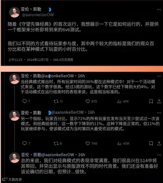 时隔一个月,在此《守望先锋2》的经典模式上线一个月之际,Aaron Keller又公布了后续的计划。他表示,在该模式上线之后,71%的玩家在发布当天至少尝试过一次该模式。36%的玩家游戏时长,也被投入到了怀旧模式当中。