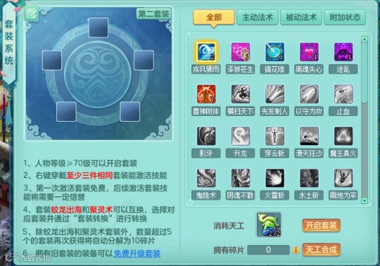 现版本法系门派比较好用的套装包括聚灵术、狂化灵法、千机百转。