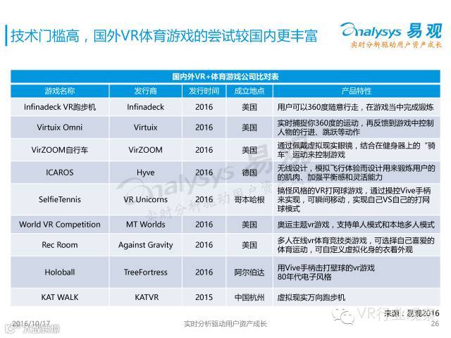 一方面,在现代生活中,由于工作繁忙、空气污染等原因,人们能够外出运动的机会越来越少,但是为了健康这一基础需求,运动却是必不可少的,这样一来,VR+体育训练就有了崛起的机会和市场,而且随着时间的推移,相信这一市场会越来越大。
