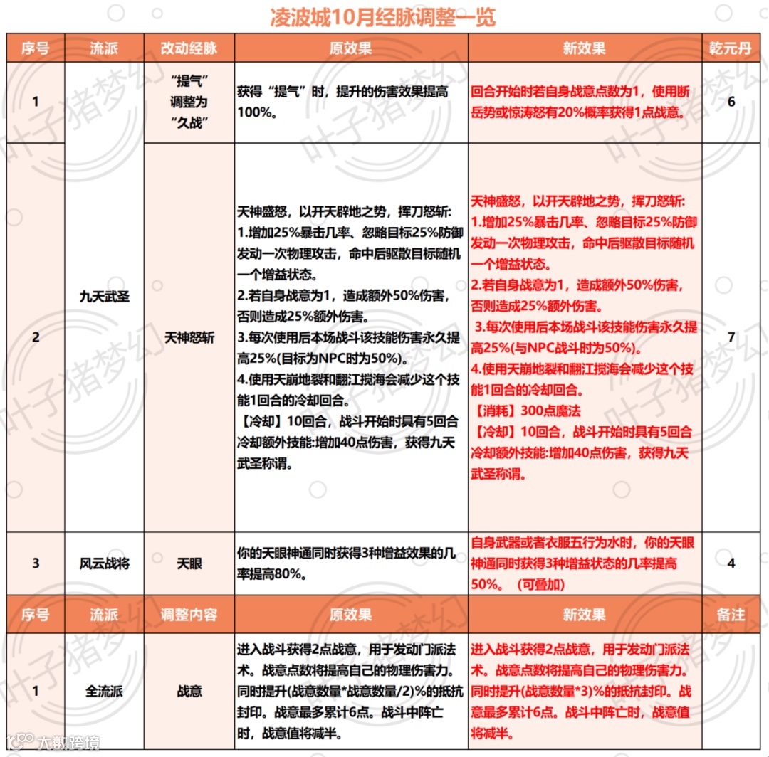 本次对凌波城的改动不大,但效果不错。首先,三个流派的“战意”被动可以提升战意等级*3%的抵抗封印,6点战意会直接带来18%的抗性效果;其次是提升了“九天武圣”流派的输出能力,使其有20%几率无限续杯惊涛怒和断岳式;最后是增强了“风云战将”的输出能力,使其在自身武器、衣服属性为水时,获得三种增益状态几率提升100%!