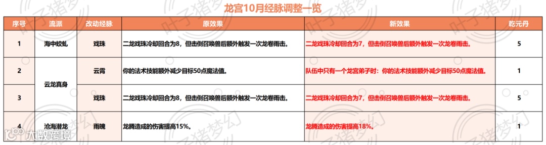 本次对龙宫的改动主要在输出能力上。“海中蛟虬”、“云龙真身”流派降低了“二龙戏珠”的冷却回合,但“云龙真身”流派的双龙打蓝战术被大砍一刀。“沧海潜龙”流派的调整比较简单,就是将龙腾的伤害由15%提升到18%,算是加强了输出效果。