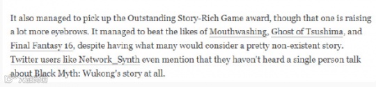 Thegamer认为《黑神话:悟空》几乎不存在剧情,却击败了《缄默祸运》、《对马岛之魂》和《最终幻想16》成为了最佳剧情游戏。同时他们还引用了网上个别网友的推文,以证明“身边几乎没人讨论这款游戏的剧情”的观点。