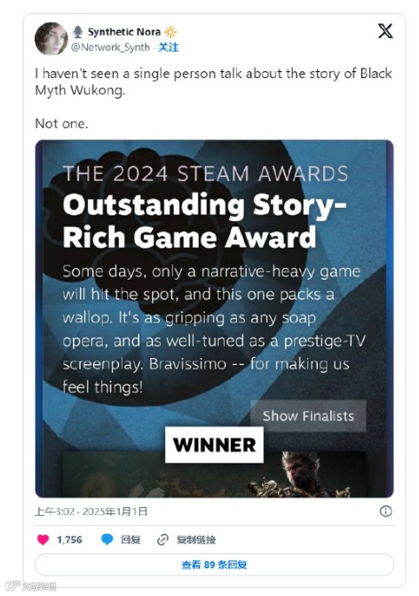 当然话又说回来了,Steam大奖作为一项完全由玩家投票决定的奖项评选,本就代表了最朴素大众的选择。你可以有自己偏爱的作品,但却不应该质疑大多数人的选择的合理性。如果真的没人讨论《黑神话:悟空》的剧情内容,那么最终的投票结果就不会是现在这副光景了。