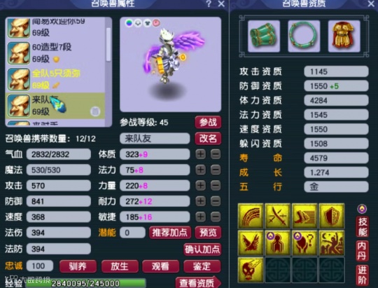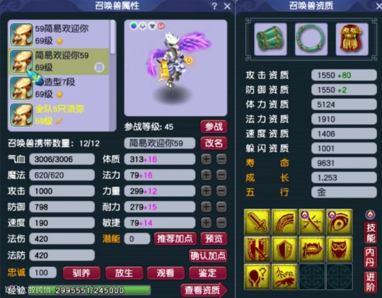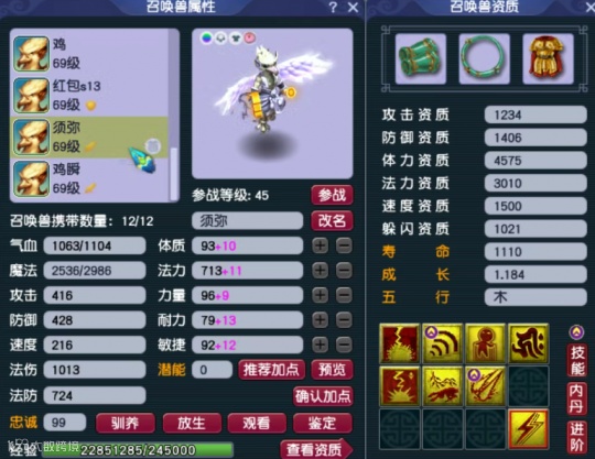 第一只召唤兽为8技能高速四吸,速度资质高达1551点。