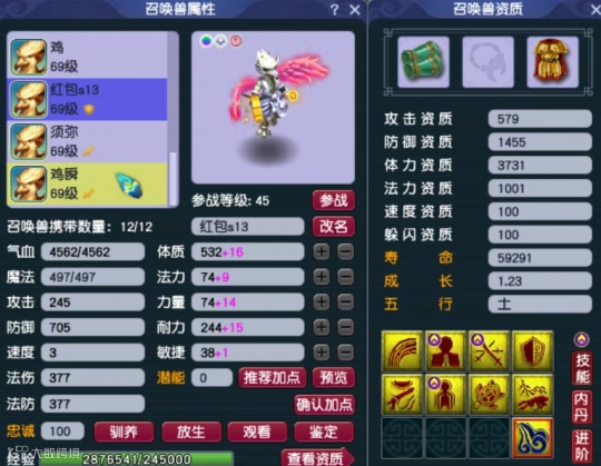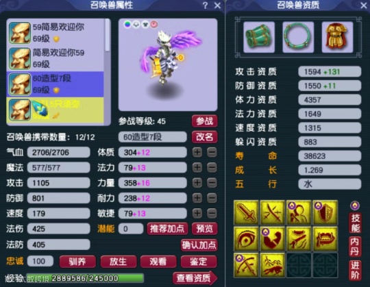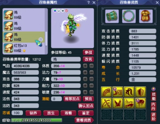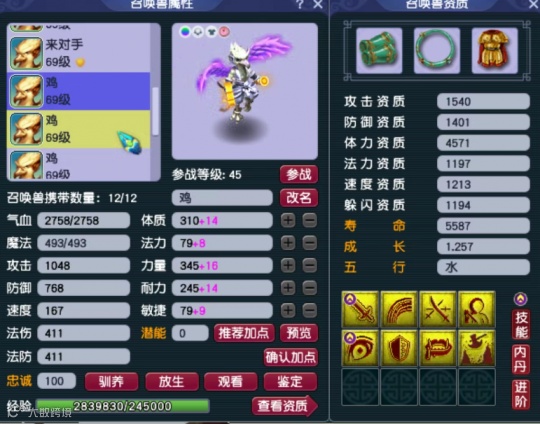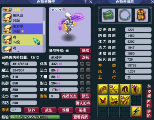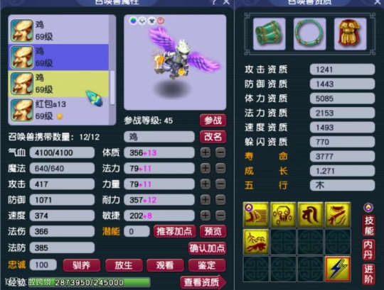 第二只召唤兽为10技能高防壁垒,攻击资质、防御资质和成长均达到了极限。