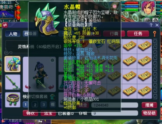 头盔部分为60级简易、精致、破血、满天,镶嵌宝石是红玛瑙,有提升伤害的作用。