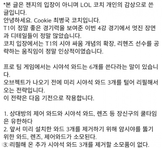 日前,GEN二队教练崔秉国发布了动态,公开了T1的战术打法和运营细节。其中,着重提到了T1的视野布控,以及针对对方辅助的举措。