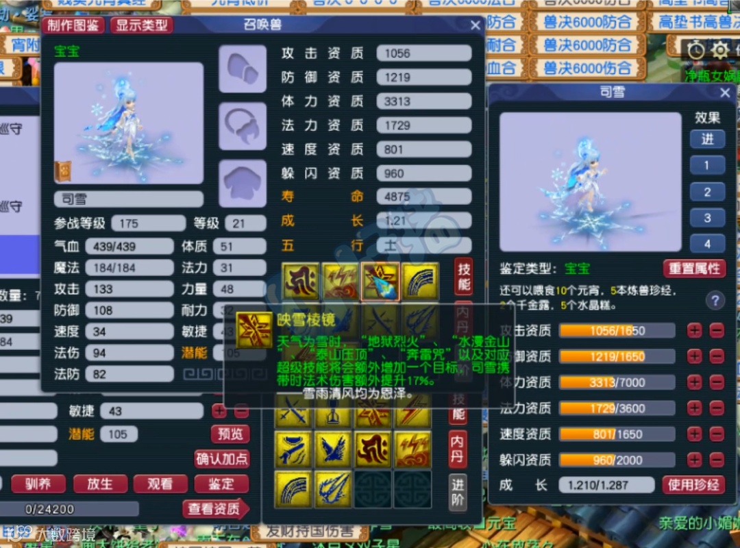 近日,一名炼妖大神经过几组高端胚子的回炉,终于合出10技能三特殊司雪。虽然它的资质面板很一般,但好在三特殊是法系组合,可以往全魔瞬法路线发展。尤其等到下雪天气,群法技能将秒四个单位,输出恐怖如斯,非常适合帮战联赛。