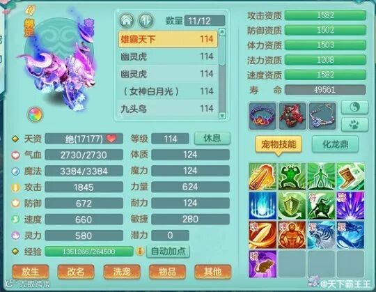 高级盾转+高级吸血,是这个宝宝的灵魂,普通耐攻宠伤害很低,即便能吸点血效果也很一般。这个宝宝正常出手时或许平平无奇,但若触发盾转效果把防御力转化为攻击力,瞬间提升两百多点面板攻击瞬间打出较高伤害并恢复可观的血量。