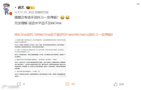 而对于chalice的话,英雄联盟圈的人也表明了自己的态度。前V5教练涵艺就在微博发布动态,直言“无法理解,说话水平远不及kkoma。”随后还贴出了T1教练kkoma,在此前采访时对BLG的评价。