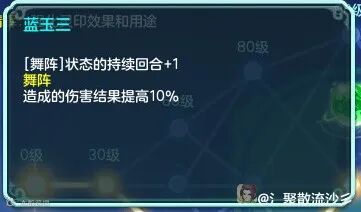 舞阵(给队友加伤害结果)强度不弱,使用频率很高,星穹点蓝玉2(舞阵持续时间+1回合)可以说百分之百用得到。点了蓝玉3之后5回合才需要续一次舞阵,让灵月能有更大的操作空间。