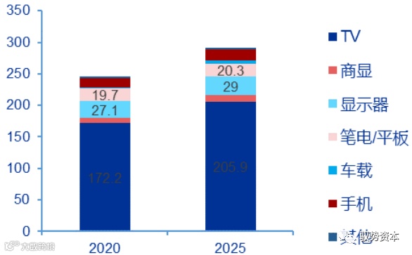 2020年,全球OLED面板出货量仅为9.7百万平方米,但从2021年起预计将以16.34%的年复合增长率增长,2025年有望达到25.1百万平方米。根据Omdia数据,面板各下游应用领域不断拓展与市场需求稳步增长,TV、移动设备作为最大应用类别保持平稳增长;商用、车载等新显示赛道快速增长。