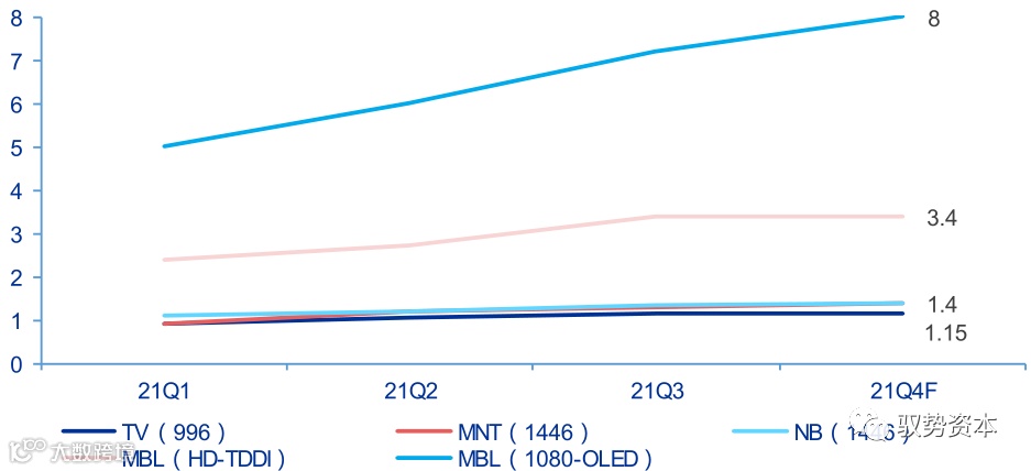 2021上半年持续的供需不平衡,叠加供应链挤兑效应,LCD和OLEDDDIC,其价格连续数个季度环比大幅上涨;但随着终端库存增长,需求波动系数放大,需求端对于DDIC的涨价接受意愿将逐步减弱。