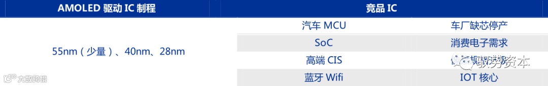 AMOLED驱动IC对制程要求较高,同制程内多种竞品盈利能力强。AMOLED驱动芯片的制程区间处于成熟制程中产能最紧张的28-55nm,这个区间内存在较多更具备盈利性优势的竞品如车载MCU、高端CIS,消费电子SoC等,使得AMOLED产能受到排挤,其需求优先级较低难以被满足。