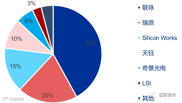 由于NB尤其注重功耗、画质及COG设计等特点提高了驱动IC的技术门槛,其供应完全由台厂主导,第一的联咏和第二的瑞鼎占据了超过60%的份额,大陆厂商参与度相对TV和MNT更低。