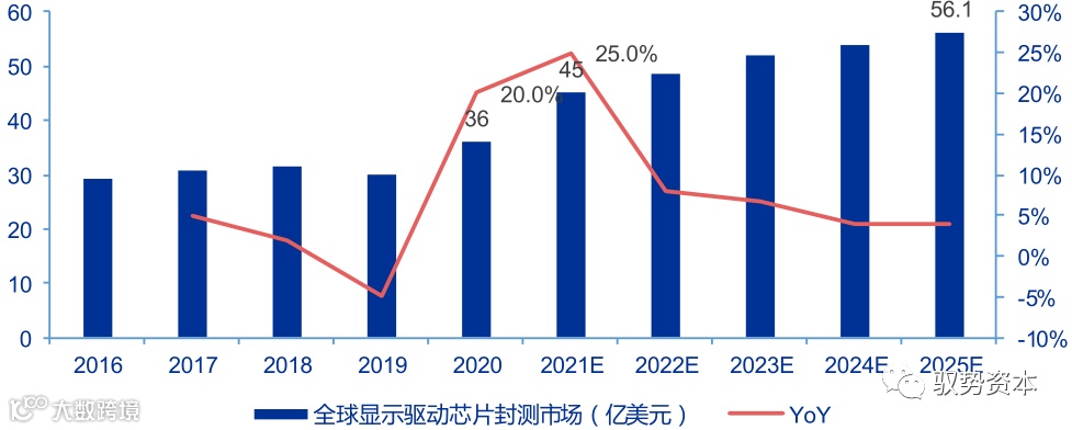 2020年,尽管疫情带来短期冲击,但居家隔离、远程办公等宅经济效应刺激了显示行业相关终端需求的爆发。同时,由于晶圆代工厂产能紧张,整体显示芯片价格不断上涨带动了显示封测市场的增长,根据Frost&Sullivan数据,全球显示驱动芯片封测市场规模于2020年达到36亿美元,较2019年增长20%,预计2021年持续增长至45亿美元,同比增长25%。