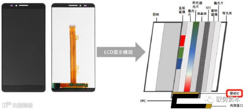 DDIC,即面板显示驱动芯片,是显示面板的主要控制元件之一。LCD驱动芯片为LCD显示屏中的灯珠提供稳定的电压或电流驱动信号,从而控制灯珠的光线强度和色彩,并在液晶片板上变化出不同深浅的颜色组合,进而保证显示画面的均匀性和稳定性。而OLED驱动芯片主要通过向OLED单元背后的薄膜晶体管发送指令的方式,实现对OLED发光单元的开关控制。