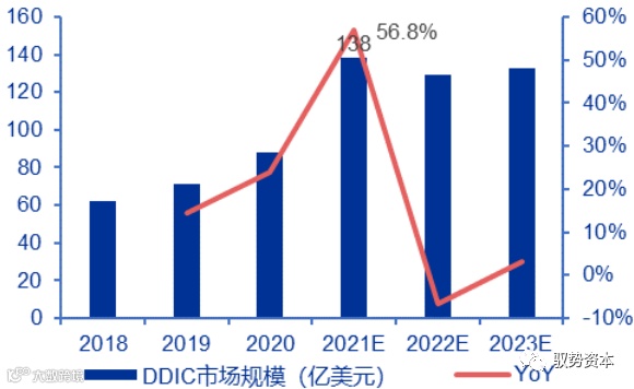 根据CINNOResearch数据,2021年全球显示驱动芯片市场规模预计增至138亿美元,增长率将达到56.8%为近年来的最高峰,也为全球集成电路芯片市场中成长力度最大的细分产业之一。目前,由于晶圆代工与封测产能短缺导致短期晶圆与封测价格不断上涨;同时,全球显示面板市场的增长也带动了显示驱动芯片长期需求量的增加。