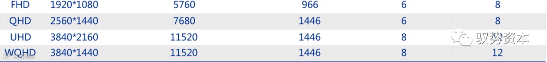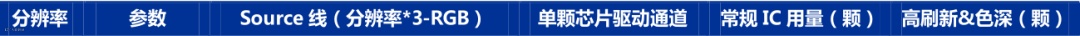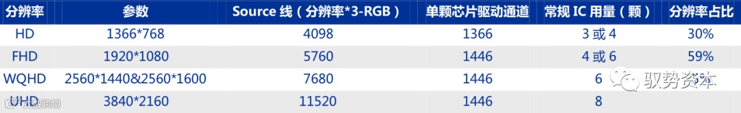 TV面板显示驱动是消耗数量最多的显示品类。显示驱动IC通过电压驱动面板的Source线来控制几百万个像素的开关状态显示画面,在常规的IC设计下,对驱动IC用量影响最大的因素为分辨率。TV面板的单颗驱动IC一般拥有960-1366个驱动通道,常规设计下一个HD分辨率的OC需要三颗驱动IC,一般FHD需6颗,UHD则需12颗。