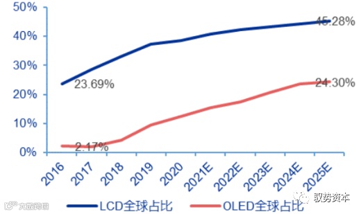 LCD面板方面至2025年我国在全球市场的出货量占比将达到45.28%;OLED领域起步较晚,主要受制于行业较高的技术壁垒早期发展缓慢,但近年随着我国的投入不断加大,整体OLED产能快速增长。2020年我国OLED面板产量占全球产量的比重12.37%,首次突破10%,预计2025年将上升至24.3%。