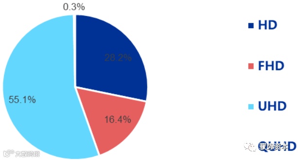 除了常规设计外,面板厂商也在开发Dualgate(一个驱动通道驱动两列)或者triplegate(一个驱动通道驱动三列)设计,入门级的32寸HD有1颗或者2颗的驱动IC设计,但目前UHD占整体TV比重超50%,这类方案在分辨率越来越高的情况实际难以实现。根据DISCEIN数据,TV面板所需要的驱动IC数量对应2.7亿片TV面板出货量全年约25亿颗规模,是消耗数量最多的显示品类。