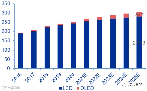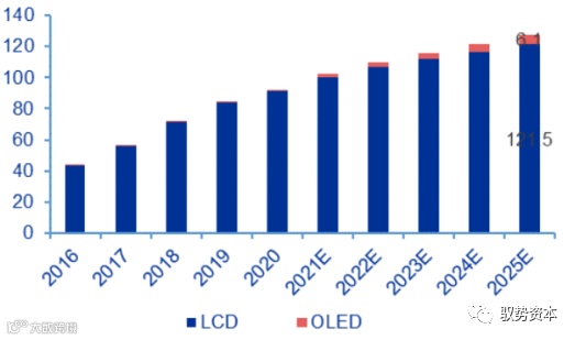 2020年,全球LCD面板出货量高达2.33亿平方米,占全球显示面板96%市场份额。LCD面板保有量高,未来将继续稳定在高出货量水平,预计2025年将达到2.79亿平方米。OLED因其独特的柔性特质,能满足曲面和折叠屏的需求,被广泛应用于手机等小屏幕产品,同时也应用于一些新兴的电子产品如智能穿戴和VR设备等。