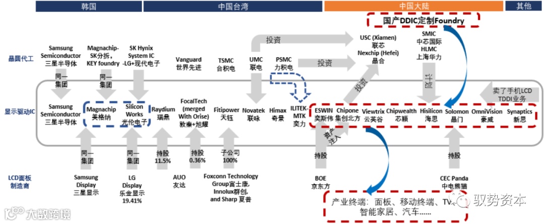 同上文晶圆代工所述,中国台湾显示面板产业上下游绑定模式发展成熟,显示驱动芯片设计厂商、晶圆代工厂、封测厂商以及显示面板产业均可形成资本与业务上的绑定,如联咏与联电绑定,联电与颀邦绑定,富士康旗下天钰、夏普、群创绑定,明基友达与瑞鼎绑定,形成全产业链模式,保障工艺开发、产能以及下游客户。