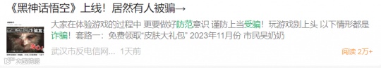 不过,与《黑神话:悟空》相关的并不都是好消息。日前,#已有多个天命人遭诈骗#的词条就登上了B站的热搜。新华社快看账号报道了这起事件,包括武汉反电信诈骗网和赣州官方在内的多个官方账号,都提到了相关的案例。