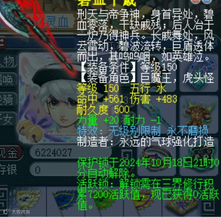 昨晚,一把顶级武器降临在了黄鹤楼服务器,这把150级斧头初总伤达到685点,造型十分霸气,在无级别与永不磨损的双双加持下,这把武器真的可以用到天长地久!