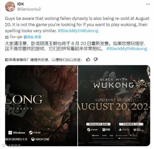 当前在推特上,已经有国外的网友呼吁玩家们在入手《黑神话:悟空》时,仔细辨别游戏的本体内容。因为《卧龙:苍天陨落》与之相当接近,如果光看拼音的话确实容易看错。