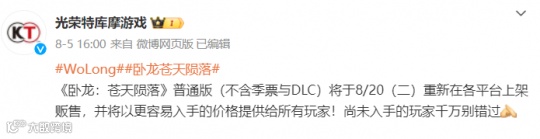 然而近期,光荣特库摩突然宣布《卧龙:苍天陨落》即将重售,并且发售日期也是8月20日。如果说,事情到了这一步还是巧合的话,二者极为相近的字体样式、海报颜色,就真的很容易让人混淆了。