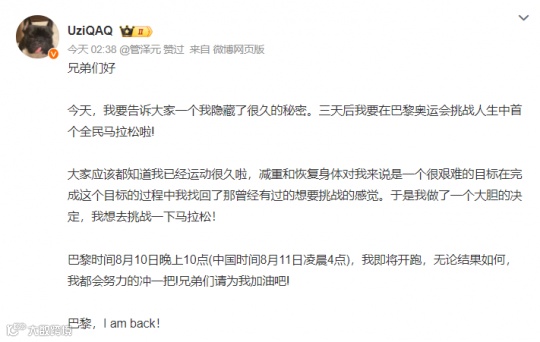 今日凌晨,Uzi就发布了微博动态,宣布将在8月10日(北京时间8月11日凌晨四点)参加这场全民马拉松。这场特别的赛事,无关性别和职业,不论你是不是专业运动员,都能参加。