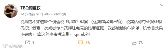 淘宝权表示,说他“卖房买自己输”的那些人拿出证据来,不要用这些子虚乌有的事情去搏流量。在评论区,他还留言道:“蛮后悔在LDL的时候没打假赛(少赚很多米)。”