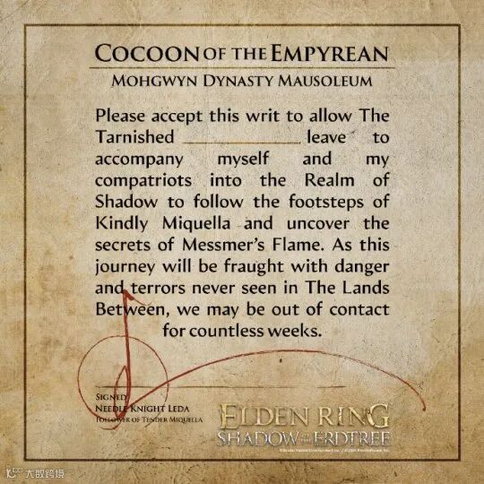 “请同意这份令状,让褪色者XXX他陪伴我和我的同胞进入幽影之地,追随善良的的米凯拉的脚步,揭开梅瑟莫之火的秘密,因为这趟路程将在充满危险和恐怖的大地上进行,所以我们可能会失去联系无数个星期。”