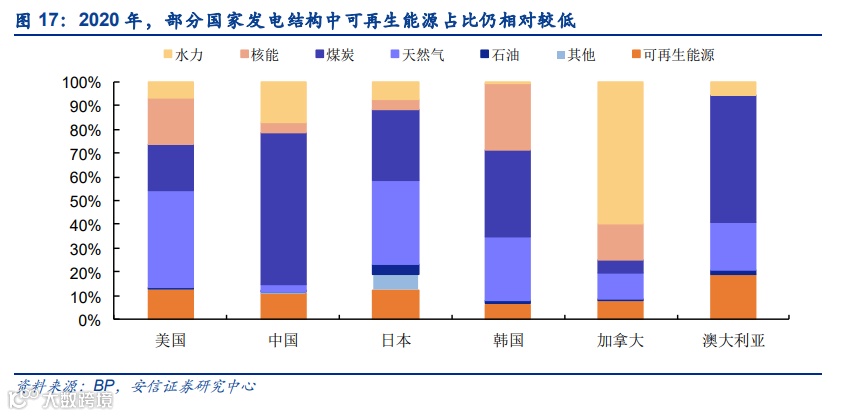 新能源发展方面,量变仍需持续推进,稳定性问题亦亟待解决。一方面,虽进程迅速,但新 能源体量尚小这一现状仍无法否认。全球视角来看,部分主要国家新能源占比仍相对较低。BP 数据显示,2020 年美国发电结构中,可再生能源占比约 12.87%,仍显著低于煤炭的 19.69%,核能的 19.40%,远低于天然气的 40.56%。中国亦然,2020 年可再生能源发电占 约 11.10%,远低于煤电的 63.22%。因此,量变问题仍存,新能源发展的推进势必还需加速, 量变是实现质变的重要前提。另一方面,新能源脆弱性凸显。碳中和推进中,若新能源非稳 定性始终未决,其量变亦难以达成质变,能源短缺或将成为困扰各国的长期痛点。新能源的 脆弱性在年初德州断电的事件中得到最先体现,之后在 9 月以来全球多国频发的能源短缺中 再次得以验证。新能源脆弱性未解下,能源结构完全清洁转型与能源安全恐难以共存,因此 新能源稳定性问题成为当下全球碳中和推进过程中的又一新的共性问题。